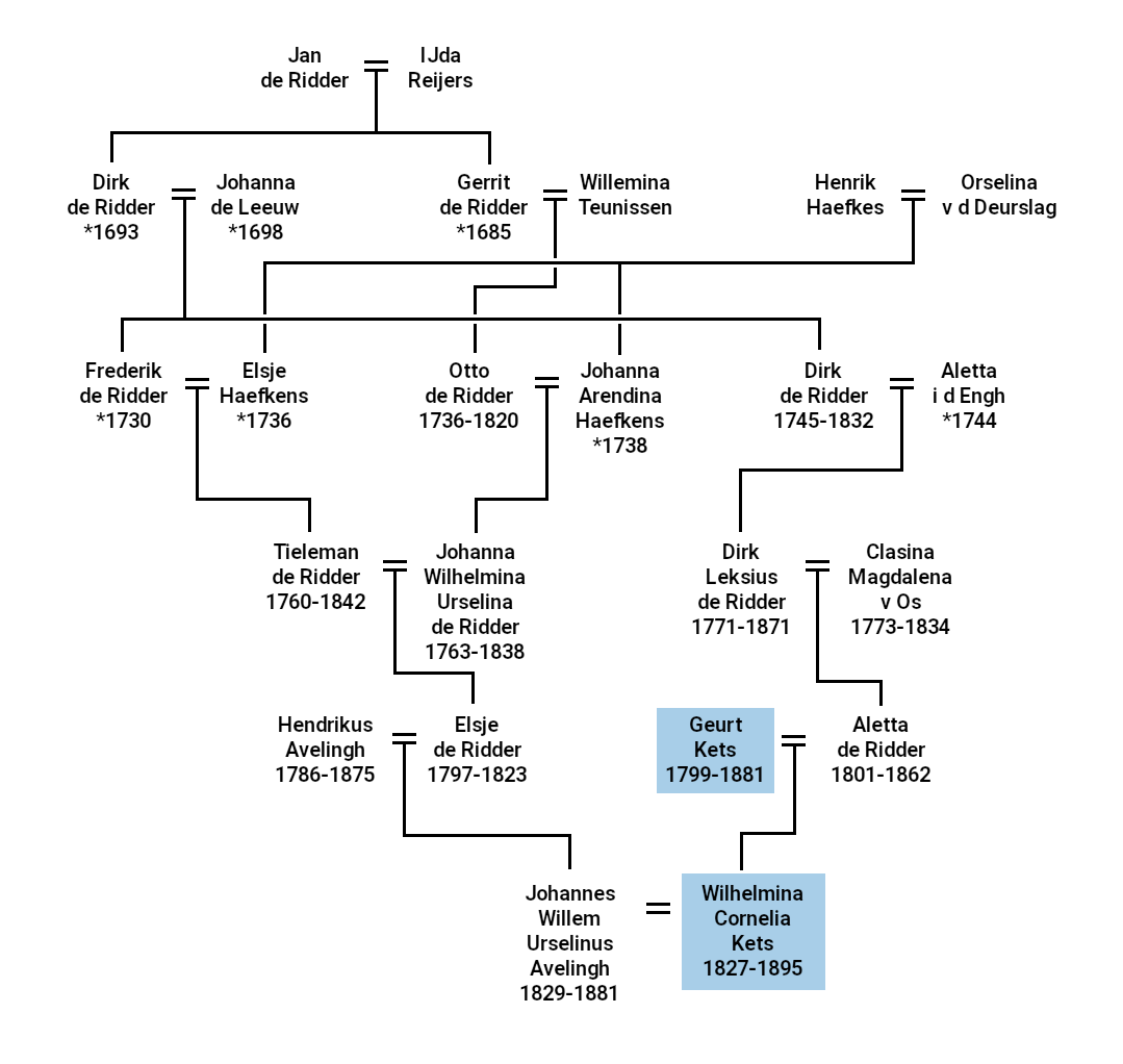 One of Geurt’s daughters, Wilhelmina Cornelia Kets (1827-1895), married Johannes Willem Urselinus Avelingh (1829-1881). His mother was Elsje de Ridder (1797-1823). I saw that surname before, Geurt Kets was married to Aletta de Ridder (1801-1862). If you’ve read my genealogy posts before, you know I just have to investigate to see if there’s a connection.